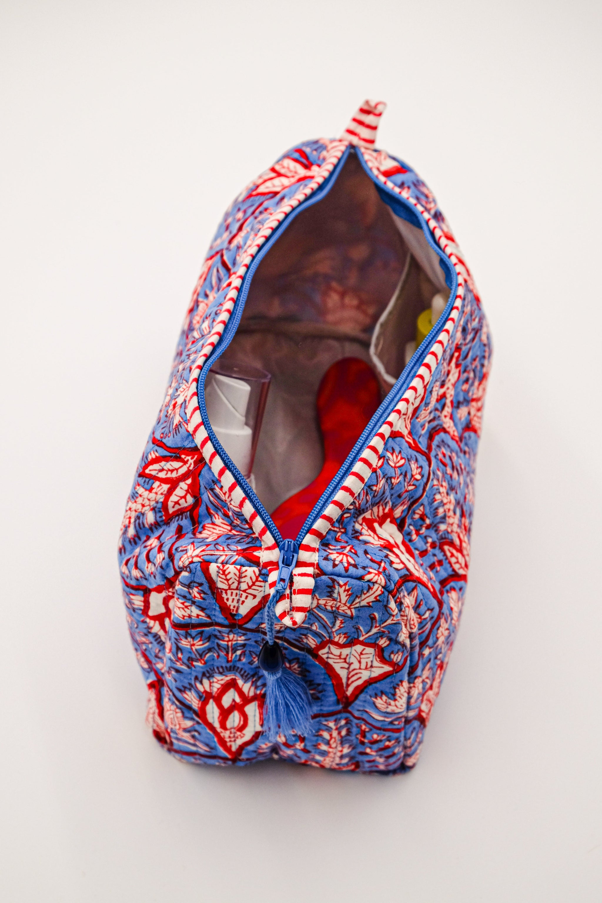 Take a little colour and joy where ever you go. These chic hand block printed cotton wash bags come in three sizes with a wipeable liner to suit your cosmetic and travel needs. Each bag has four internal pockets to store all your trinkets.
