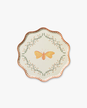 Light, bright, and full of charm, The Flutter Dessert Plate will add a whimsical, yet elevated accent to any tabletop. Centered with a hand-painted butterfly motif and framed by botanical garlands, this plate set is perfect choice for garden gatherings, brunches or celebratory showers. Ideal for small bites and desserts, or layered on The Flutter Dinner Plate for a fully-styled table top.