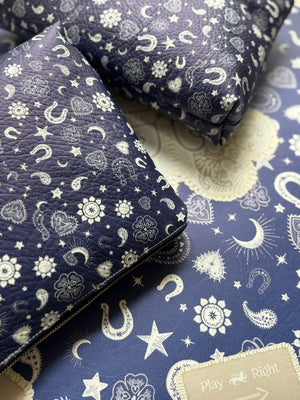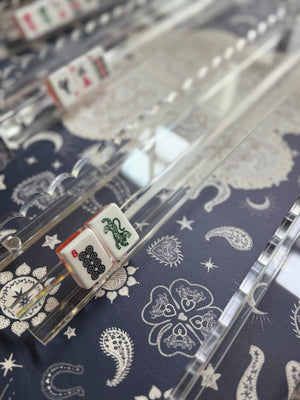 This delightful bandana print is sprinkled with lucky little symbols to keep the good vibes flowing. Featuring beloved icons from our brand and brought to life by a talented independent female artist, it adds a charming touch to your mahjong gatherings. Perfect for enjoying with friends and creating a stunning setup that stays out long after the game ends.