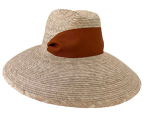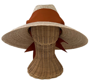 This sun hat ships woven with a wide & short rust/burnt orange grosgrain ribbon.